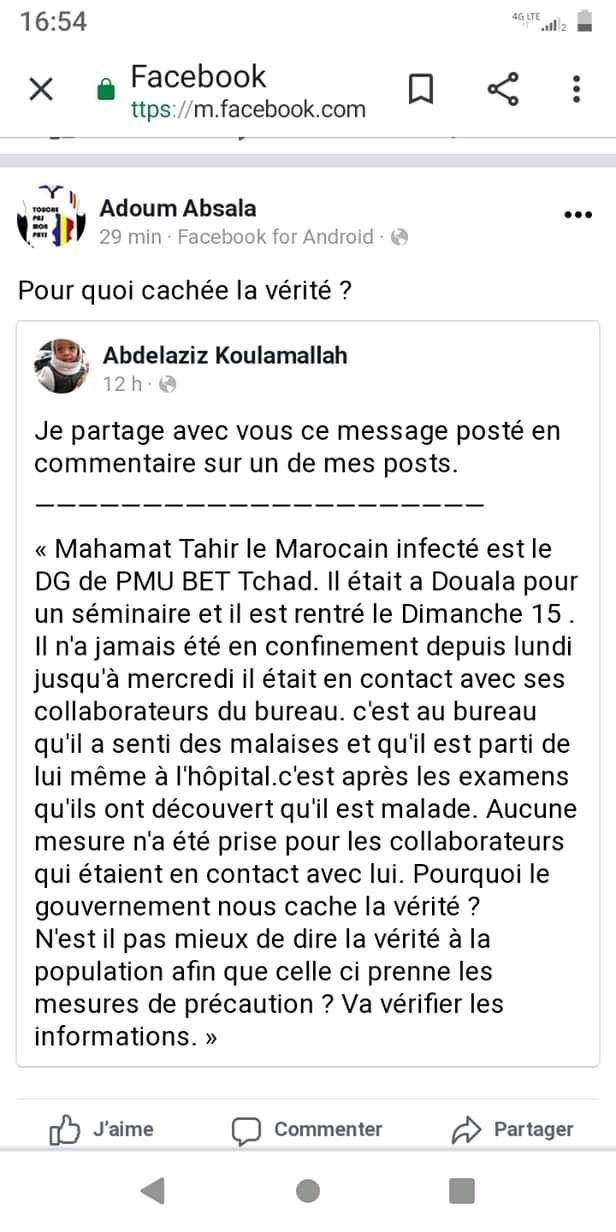 Le Covid-19 est un fléau qui a paniqué le monde entier en temps record. Plusieurs pays dont le continent africain en compte aujourd'hui 30 pays atteints de la maladie. Pour le Tchad, aucun cas n'a été découvert jusqu'à présent. Sauf que ce matin ,les mauvaises interprétation ont voulu faire comprendre qu'un cas serait détecté à Moundou sur un homme mais au fond rien n'est découvert a démenti le gouverneur Dago.